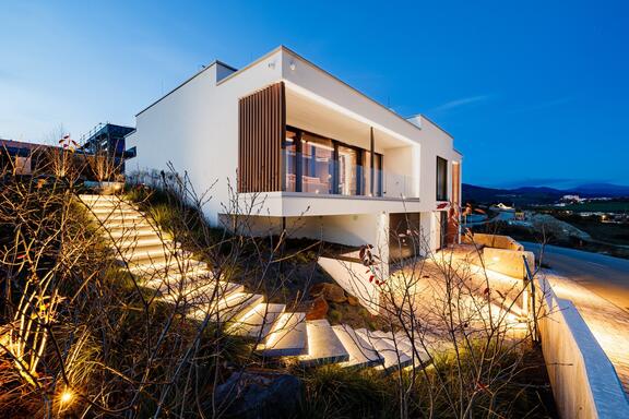 Každý projekt je pre nás výzvou vytvoriť niečo výnimočné. Naše veľkoformátové platne nie sú len schodmi - sú architektonickým prvkom, ktorý definuje charakter celého priestoru. S možnosťou integrácie moderného LED osvetlenia vytvárajú pôsobivé svetelné efekty a dodávajú priestoru dramatický nočný vzhľad.