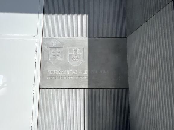 Pre projekt Mestský úrad v Leopoldove sme dodali tieto nádherné slnečné hodiny a platne - fasádne prvky z pohľadového sivého betónu na ktorých je znak Slovenskej republiky , erb mesta Leopoldov a označenie mestskej knižnice.