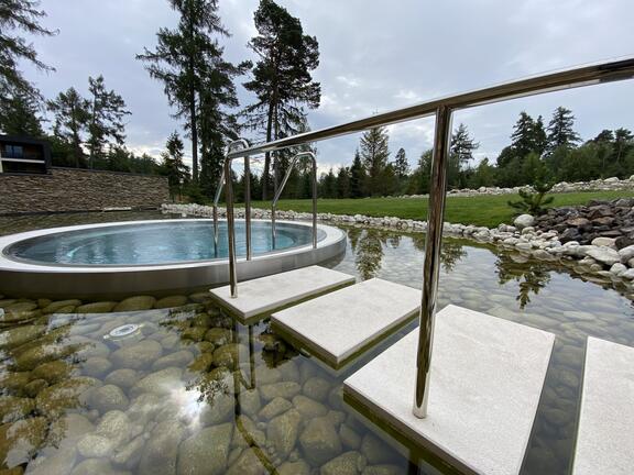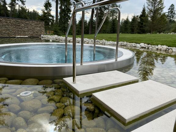 Sme veľmi potešení , že sa naše výrobky opäť podarilo dostať na tak krásne miesto , ako sú naše Tatry. Tieto krásne masívne stupne z bieleho štokovaného betónu môžete nájsť v priestoroch luxusného Hotela Hills v Starej Lesnej. Masívne stupne v tomto prípade neslúžia len ako schodisko, sú osadené pod vodou a vytvárajú tak krásnu cestičku do externého bazénu pre hostí hotela.
