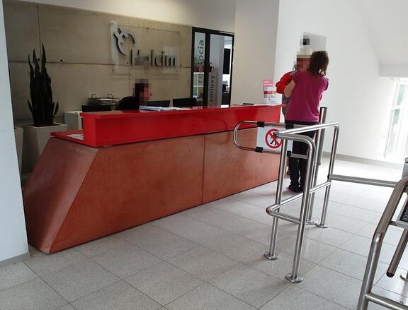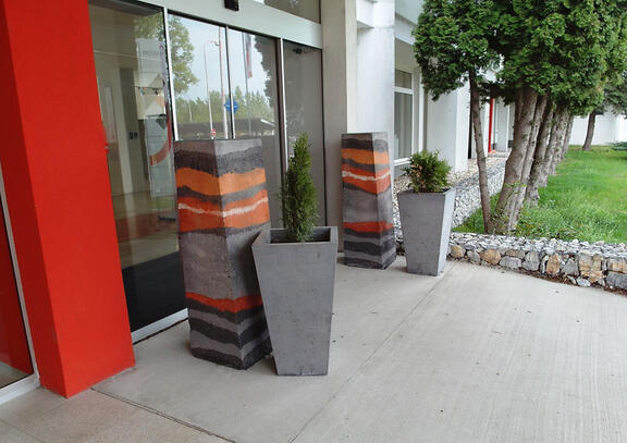 Pre tento projekt sme vyrobili recepčný pult z červeného betónu , stolíky z bieleho betónu a kvetináče pred vstupom do budovy z pohľadového betónu vo farbe antracit.