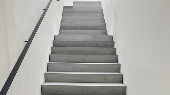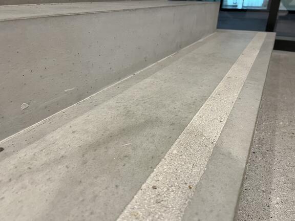 Použitý povrch na schodoch bol pohľadový sivý betón a na veľkoformátových platniach je to mikro-vymývaný sivý betón.