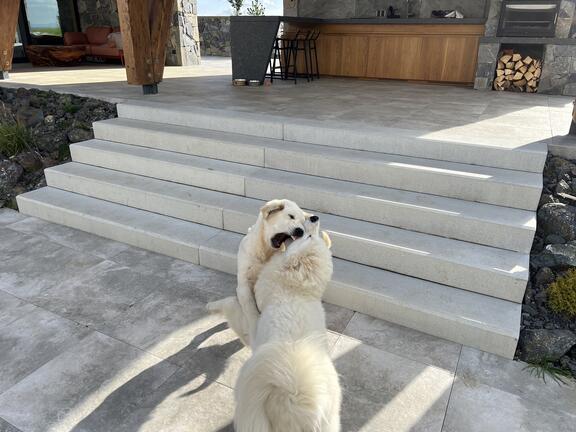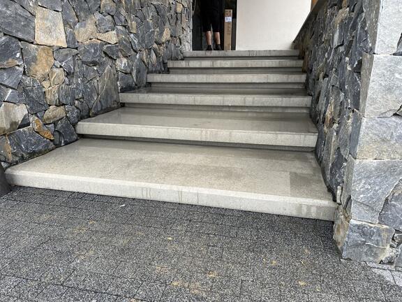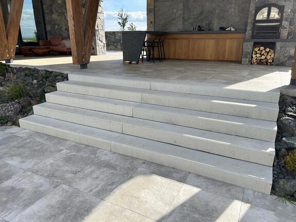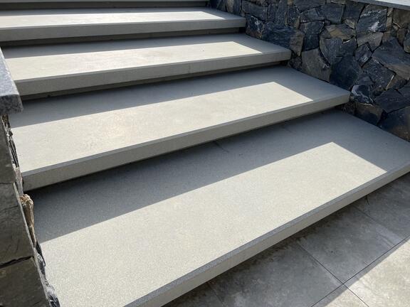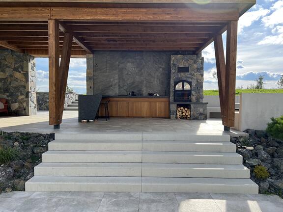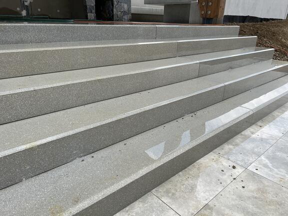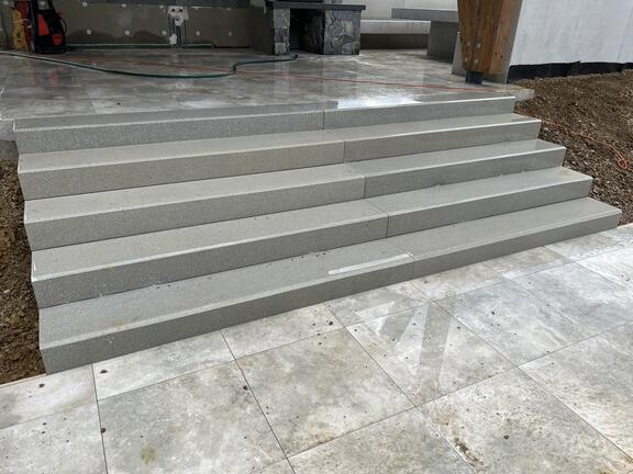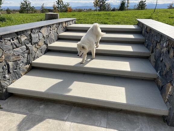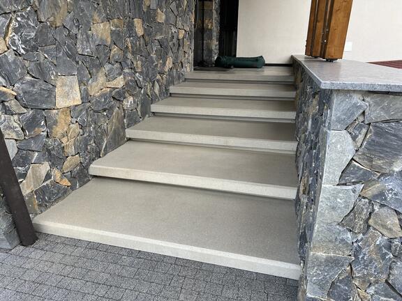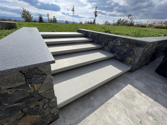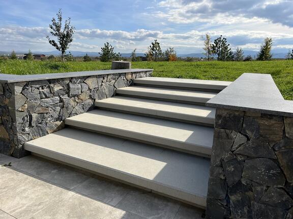 Nádherný projekt, pre ktorý sme dodali veľkoformátové schodiskové platne, ďalej môžete vidieť klasické extérierové schodisko pozostávajúce z masívných stupňov. Všetky prvky sú vyrobené na mieru podľa požiadaviek zákazníka.