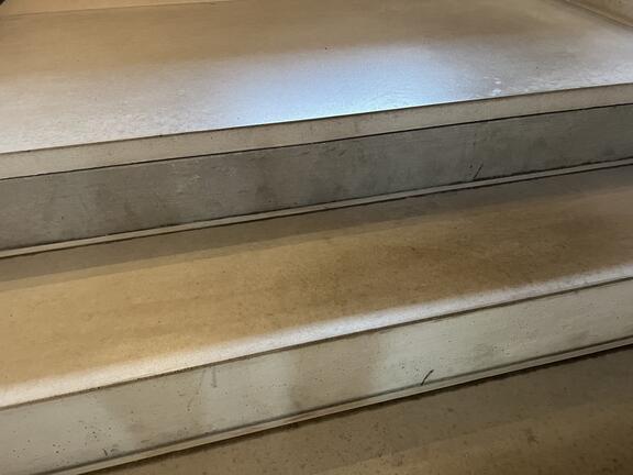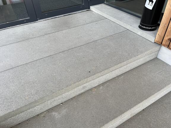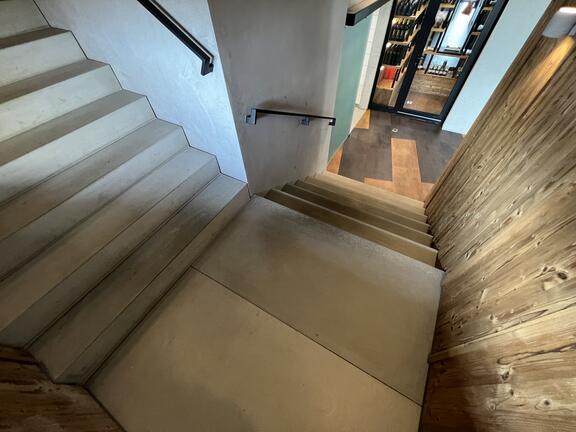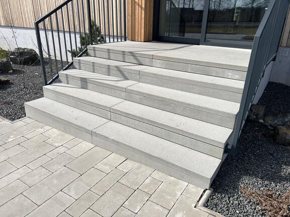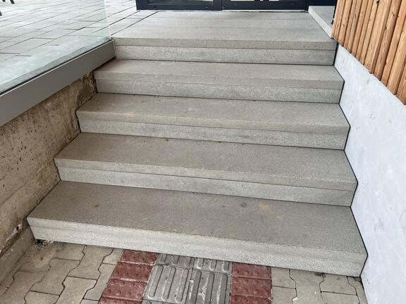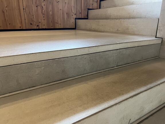 Pre tento projekt sme vyrobili na mieru viac druhov schodov a podesty. Je to kombinácia schodov typu nástupnica + podstupnica a schodov typu " L " , pre ktoré je typické to , že vznikne iba jedna vodorovná špára medzi jednotlivými stupňami. Podesty boli vyrobené z viacerých kusov veľkoformátových platní.