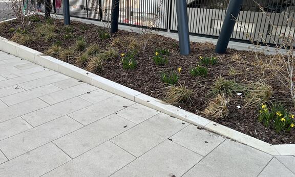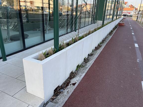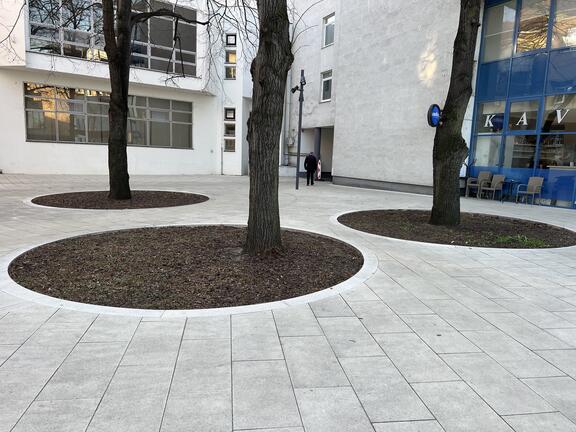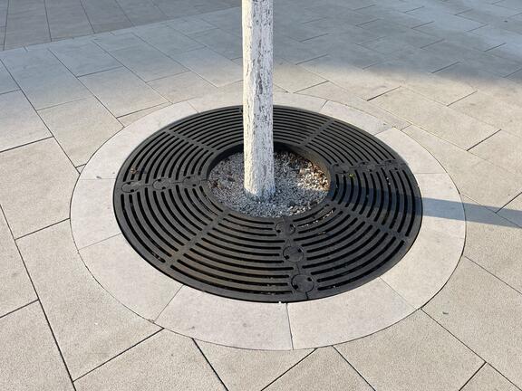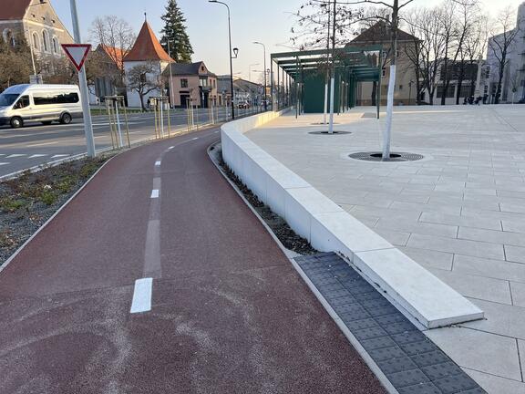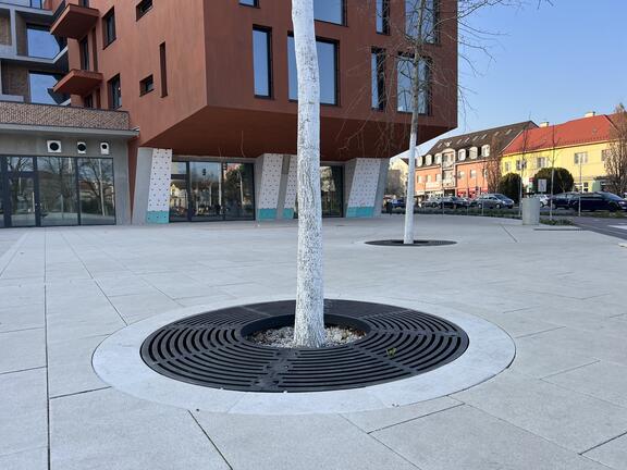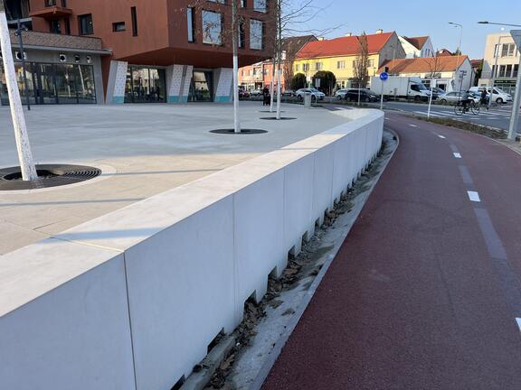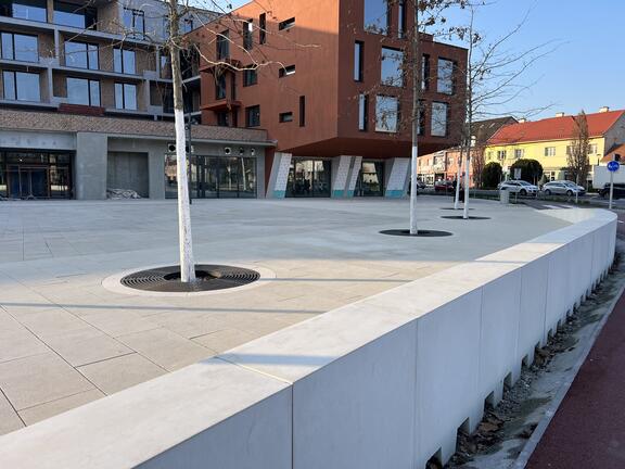 Pre tento nádherný projekt sme vyrobili lemy / obruby okolo stromov , ktoré boli vyhotovené v rôznych veľkostiach a tvaroch. Ďalej tu môžete vidieť naše veľkoformátové platne - schody, oporné múry - lemy ktoré oddelujú pešiu zónu od výsadby. Vyrobili sme tiež masívné bloky a záhony , ktoré oddelujú pešiu zónu od miestnej komunikácie.