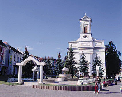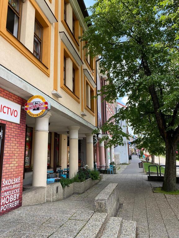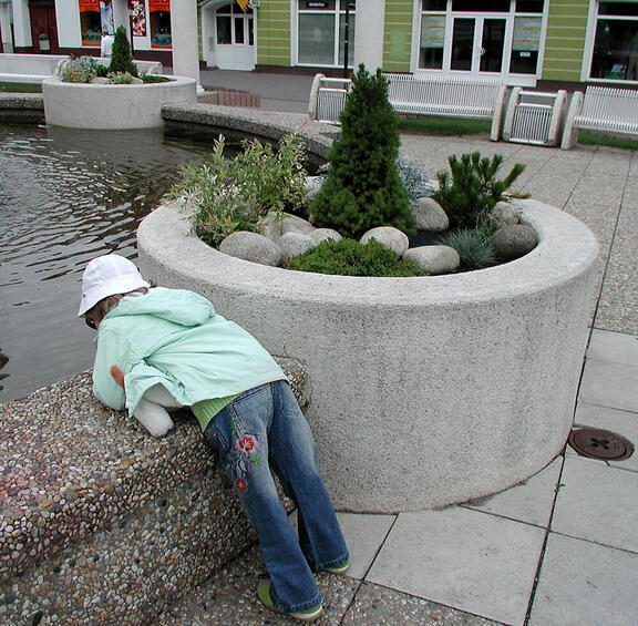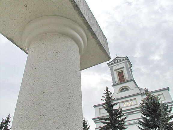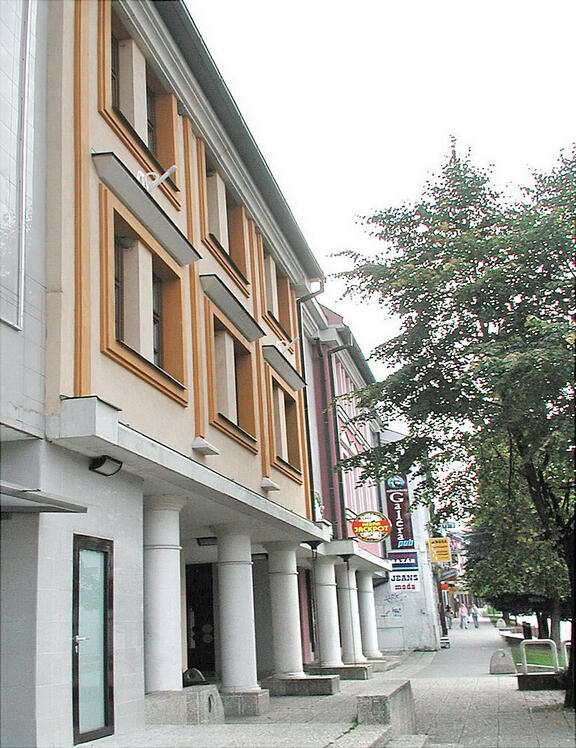 V blízkosti fontány sa nachádza budova bývalej banky (IRB), pre ktorú sme v roku 1994 vyrobili z bieleho betónu fasádne prvky a kruhové nosné stĺpy s priemerom 50 cm.