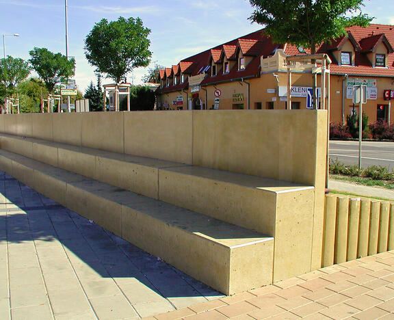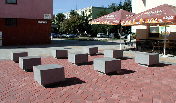 Pre tento projekt sme vyrobili betónové prefabrikáty a to konkrétne lavice na sedenie vo forme žltých betónových blokov a betónové sedáky.